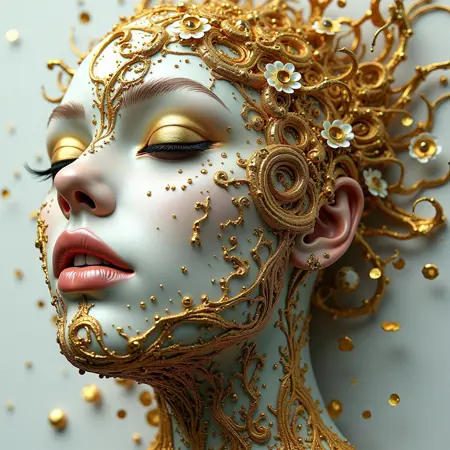 이 모델은 성장과 아마도 고통스러운 경험이 동반하는 내적 변화를 반영합니다. 이를 시각적 이미지로 어떻게 전달할 수 있을까요? 예를 들어, 사람과 퍼즐을 사용할 수 있습니다. 압도적인 시네마틱 3D 판타지 초상화. 아름다운 여인의 얼굴을 퍼즐 조각으로 구성하고, 일부 조각은 빠져 있거나 다른 방향으로 날아가는 디지털 예술 작품을 창조하세요. 이는 가벼움과 분할의 효과를 만들어냅니다. 여인의 피부는 황금색이며, 눈은 어둡고 표현력 풍부하며, 차분하면서도 매력적인 표정을 띠고 있습니다. 어두운 배경은 그녀 얼굴의 밝은 특징과 빠진 퍼즐 조각 사이의 대비를 부각시킵니다.
