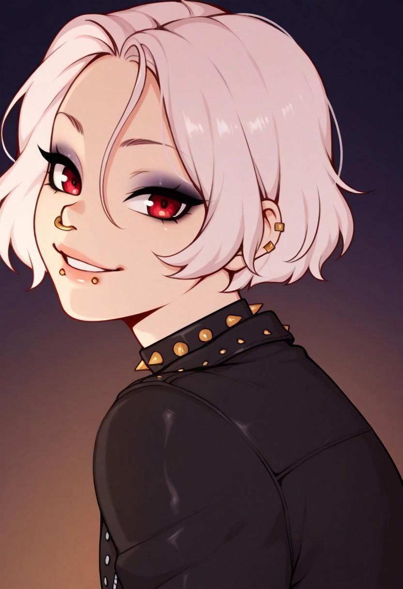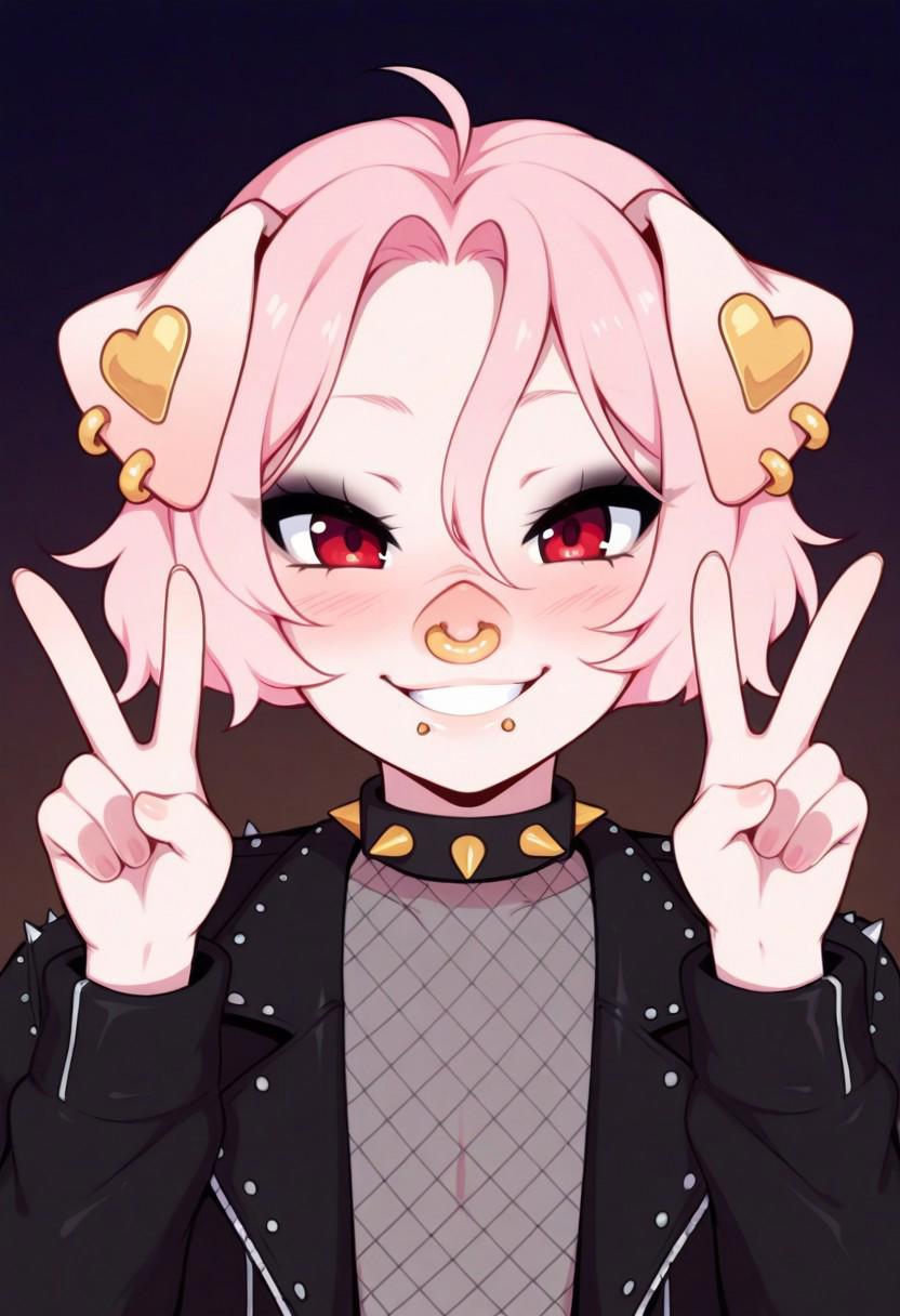 | トレーニングワード | Hrfrkyhw, red eyes, light hair, short hair, parted bangs, forehead, eyeshadow, lip piercing, nose piercing, spikes, trap, androgynous, 1girl,コピーしました! 1boy, human, finger tattoo, tattoo, cheek piercing, ear piercing, pink hair, makeup, furry, animal ears, pink eyes, colored skin, pink skin, earrings, ahoge, pig ears, pig nose, pig girl, pig boy, pig tail,コピーしました! open leather jacket, fishnets shirt,コピーしました! |