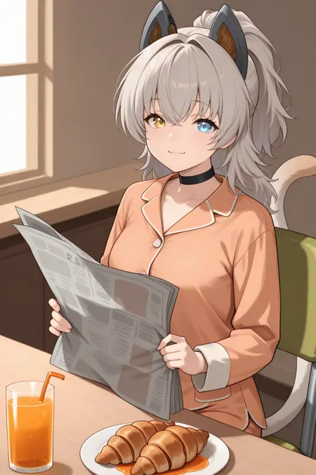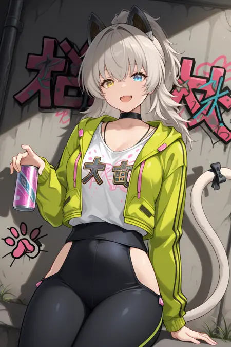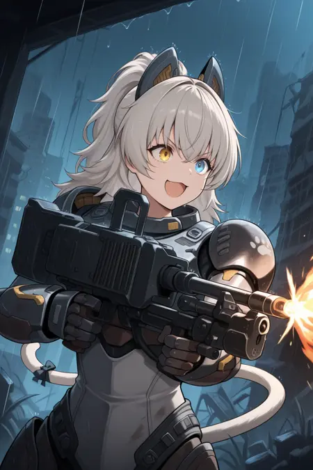 外見:p3r1ty4、猫の耳、機械の耳、猫の尾、異色瞳、オレンジ色の目、青色の目、灰色の髪、額の間の髪、長い髪、高いポニーテール、黒い首輪