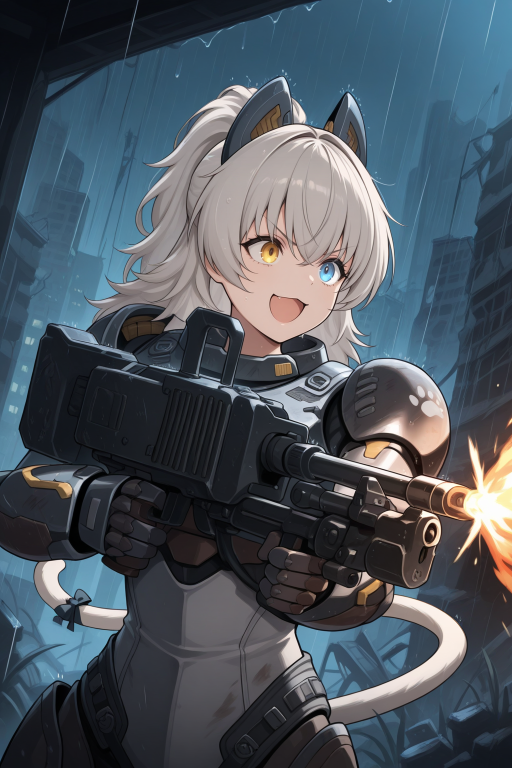 • 外观:p3r1ty4,猫耳,机械耳,猫尾,异色瞳,橙色眼睛,蓝色眼睛,灰色头发,头发遮住眼睛,长发,高马尾,黑色项圈