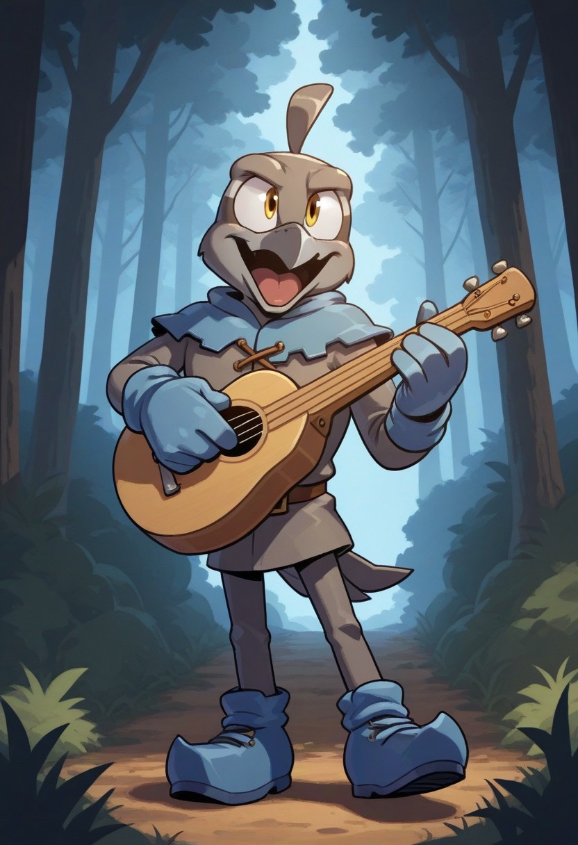 Alan the Quail, dark brownish gray skin, yellow eyes, gray beak, gray tunic, brown belt with gold buckle, blue gloves, blue shoes, holding guitar