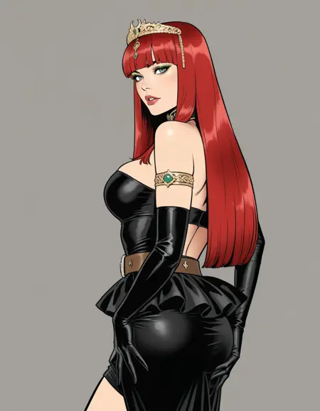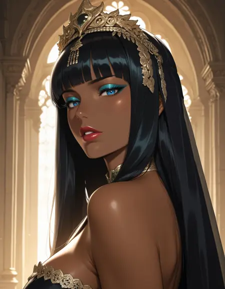 黒髪、まっすぐな前髪、多色のアイシャドウ、唇、高い頭飾り で呼び出し