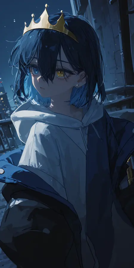 1girl, 短发, 刘海, 蓝眼, 深蓝色头发, 发丝遮眼, 黄眼, 多彩发色, 异瞳, 蓝色内发, 左眼蓝色, 右眼黄色,