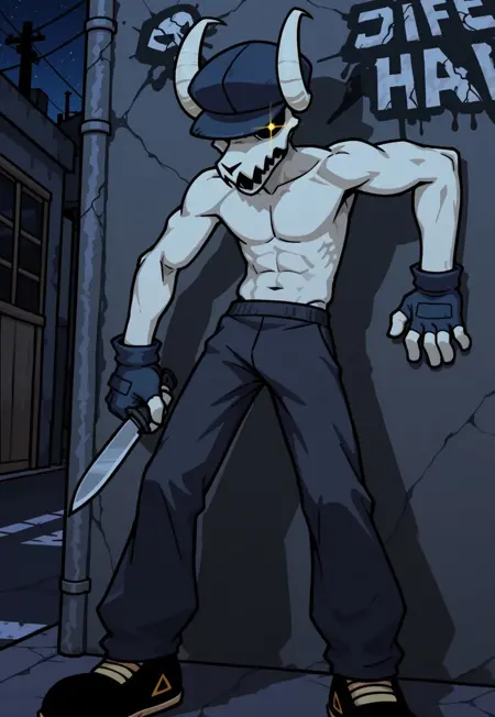 Tags (Genocidal): humanoid, skull head, horns, yellow pupils, glowing eyes, white skin, cracked skull, dirtied skull, dirtied clothing, floating head, ((genocide tabi)), dark blue cap, grayish blue hoodie, long sleeves, dark blue gloves, fingerless gloves, dark gray sweatpants, black and white sneakers, torn clothing, torn hat