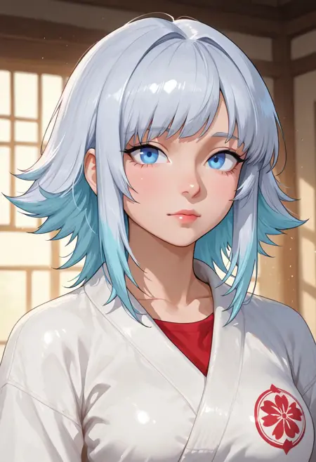 illustrious:lora:azure-v2 azure,sweet punishment,Light blue eyes, medium hair, silver hair,fluffy hair, unruly hair, light blue hair, two-tone hair,left side bangs, side strands, medium breasts, stretched eyes,(cat's pupil)