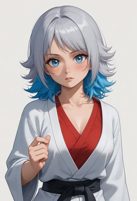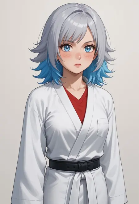 illustrious:lora:azure-v2 azure,sweet punishment,Light blue eyes, medium hair, silver hair,fluffy hair, unruly hair, light blue hair, two-tone hair,left side bangs, side strands, medium breasts, stretched eyes,(cat's pupil)
