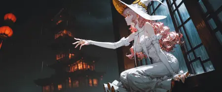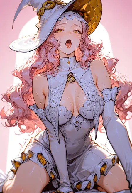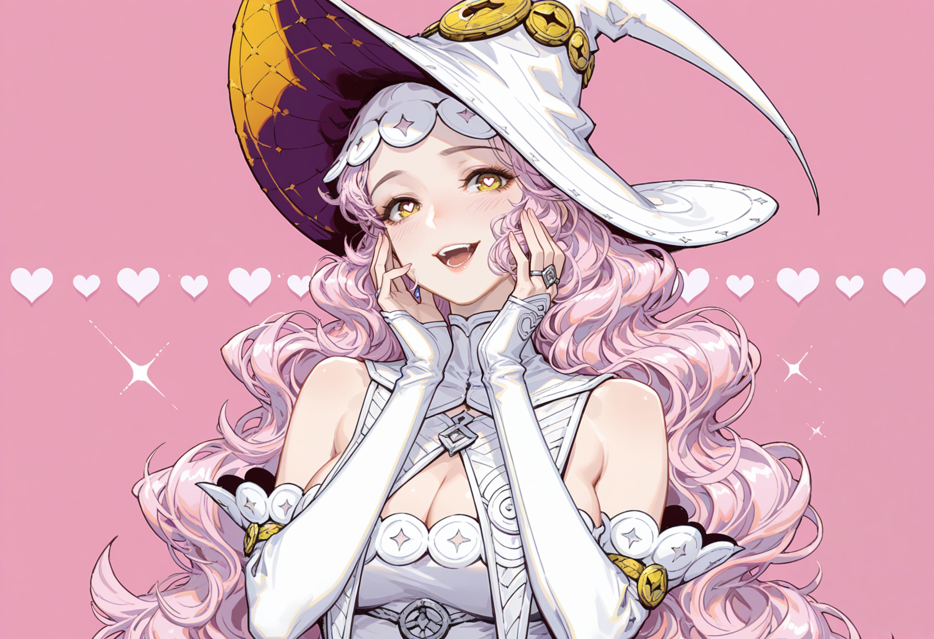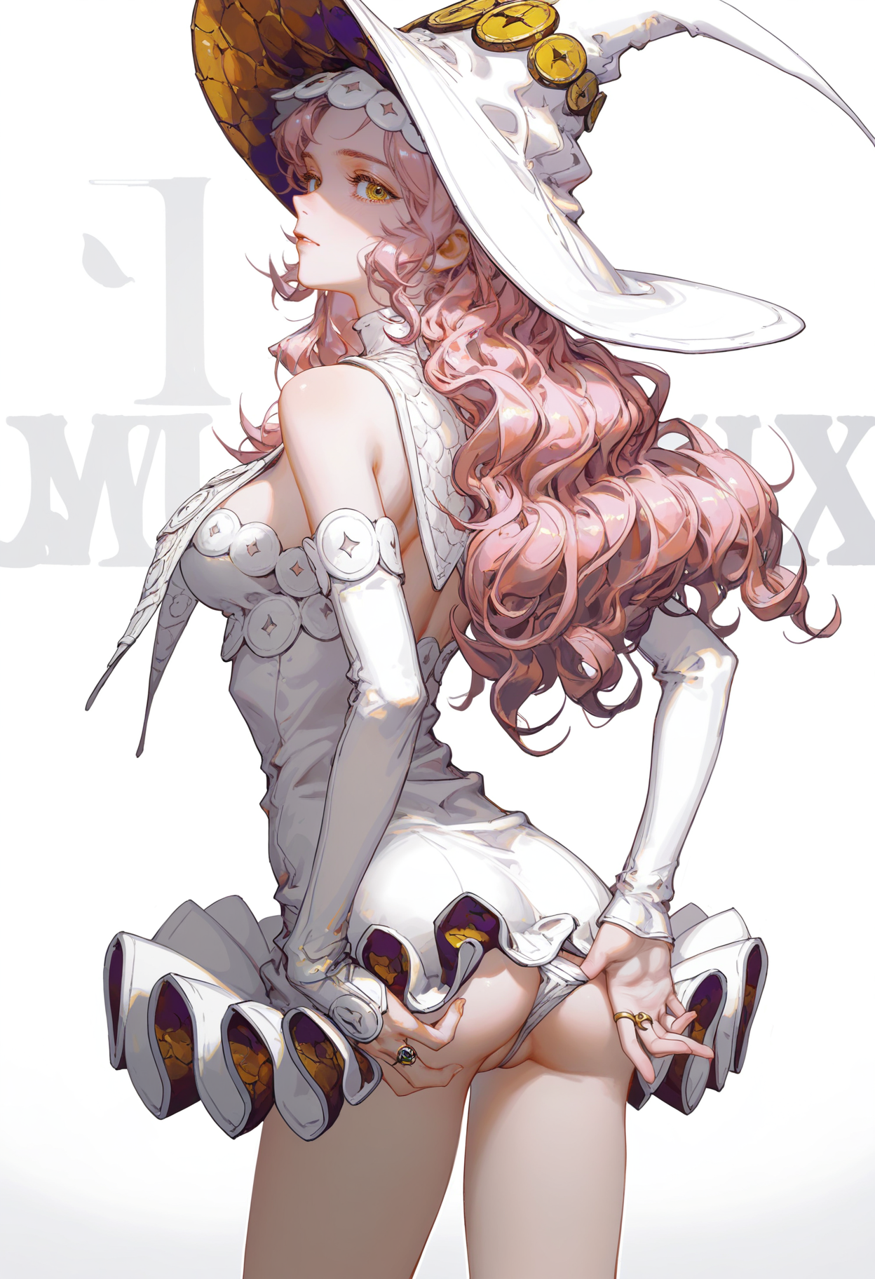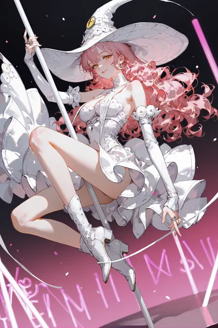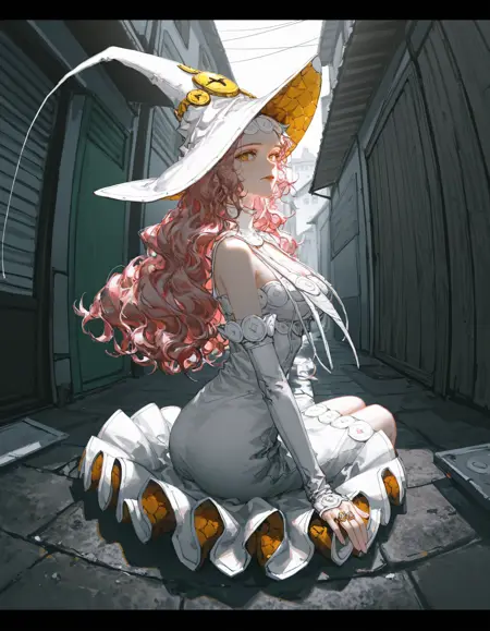 선택적 의상 태그 1: yifu,witch,witch hat,white dress,white headwear,detached sleeves,bare shoulders,white long gauntlets,cleavage,jewelry,ring,white footwear,yellow ruffled skirt,breast curtain,
