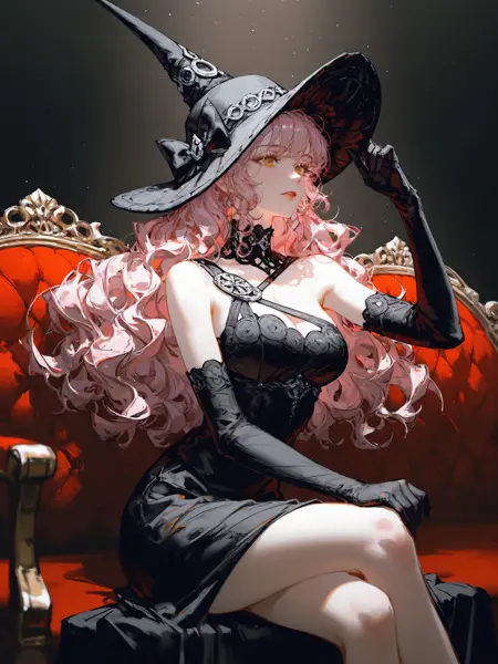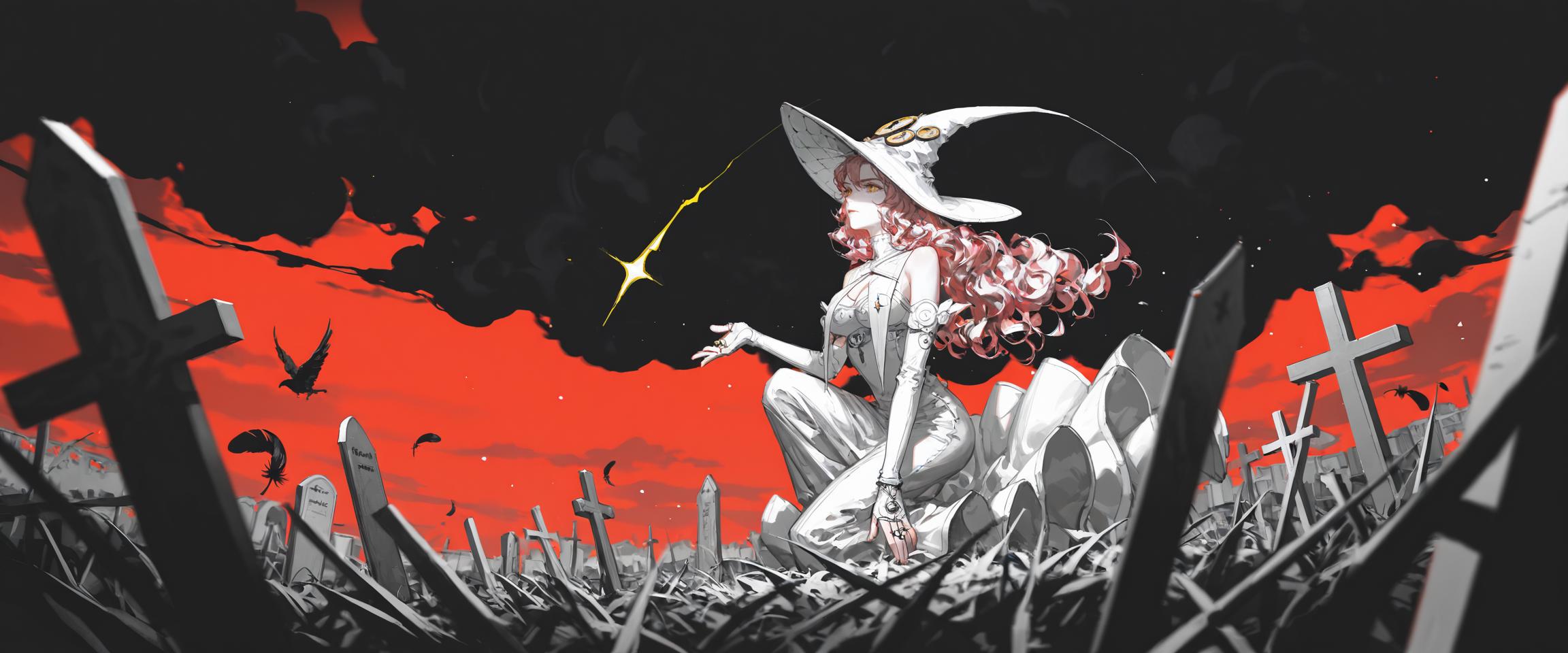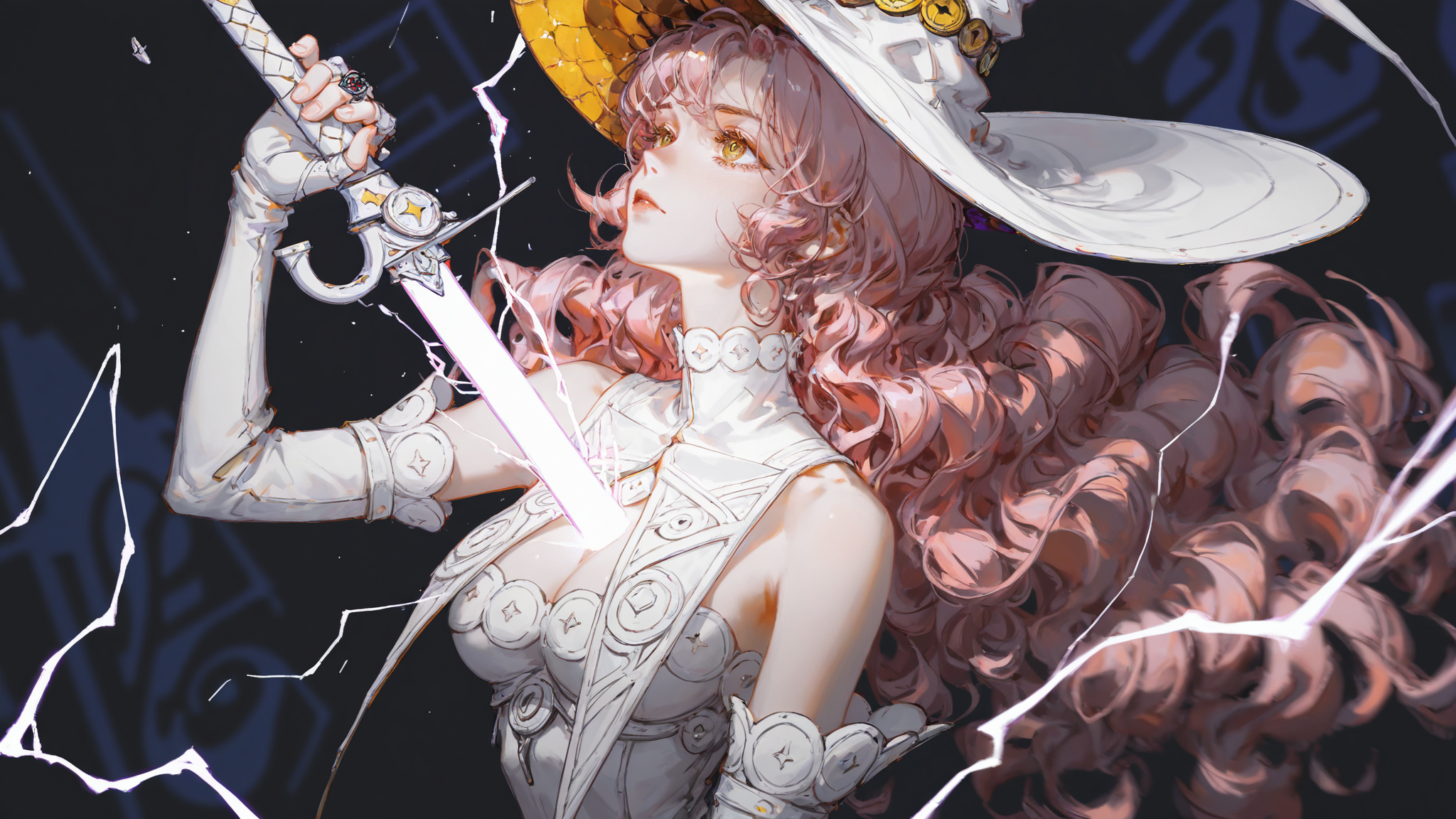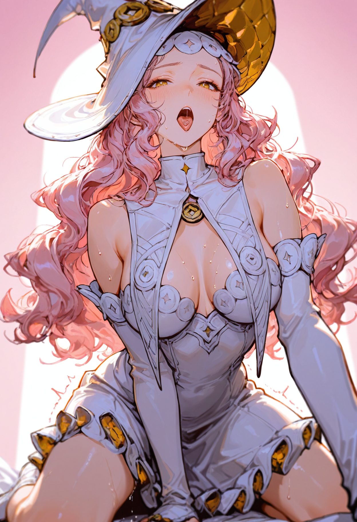 선택적 의상 태그 1: yifu,witch,witch hat,white dress,white headwear,detached sleeves,bare shoulders,white long gauntlets,cleavage,jewelry,ring,white footwear,yellow ruffled skirt,breast curtain,