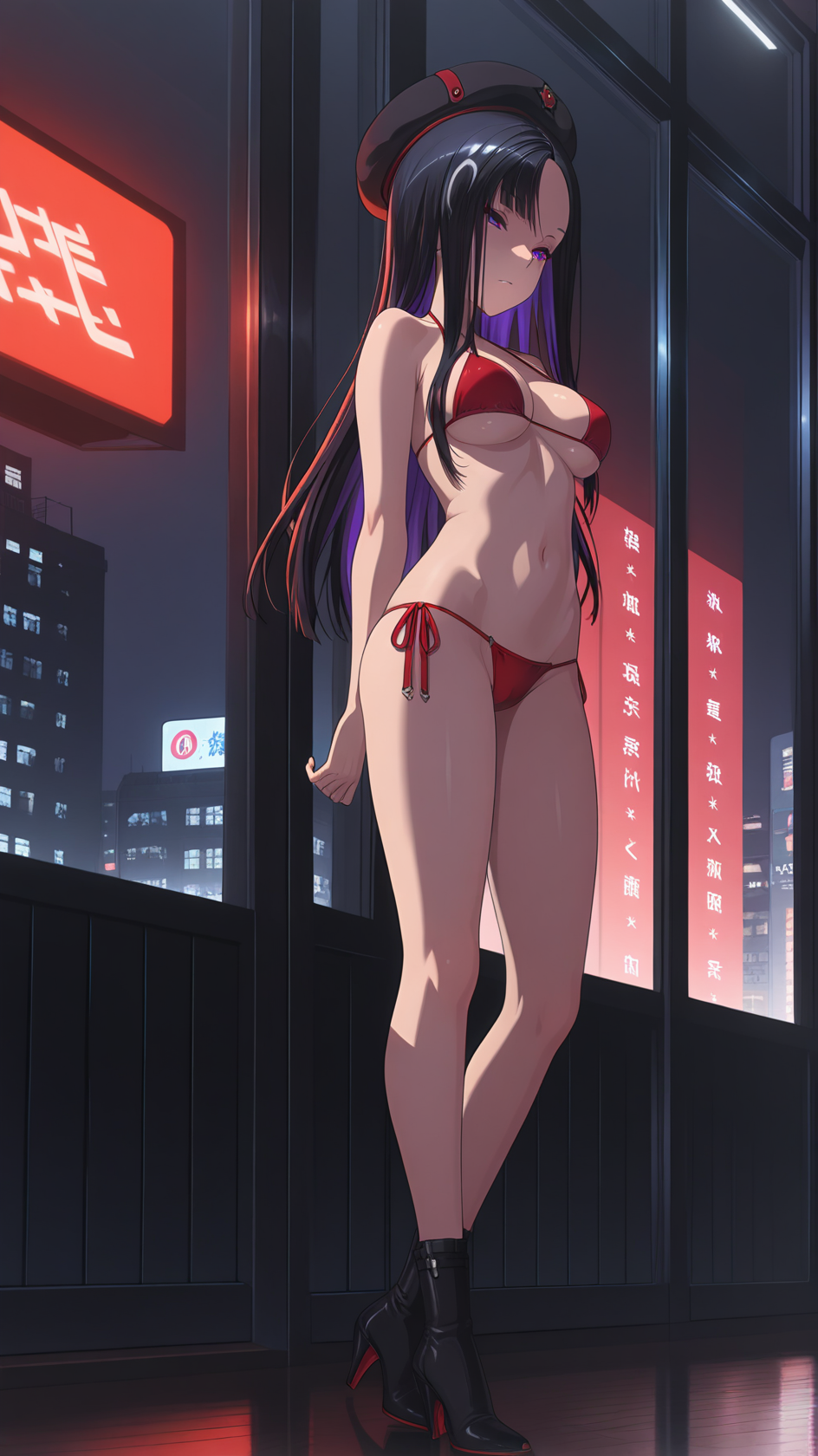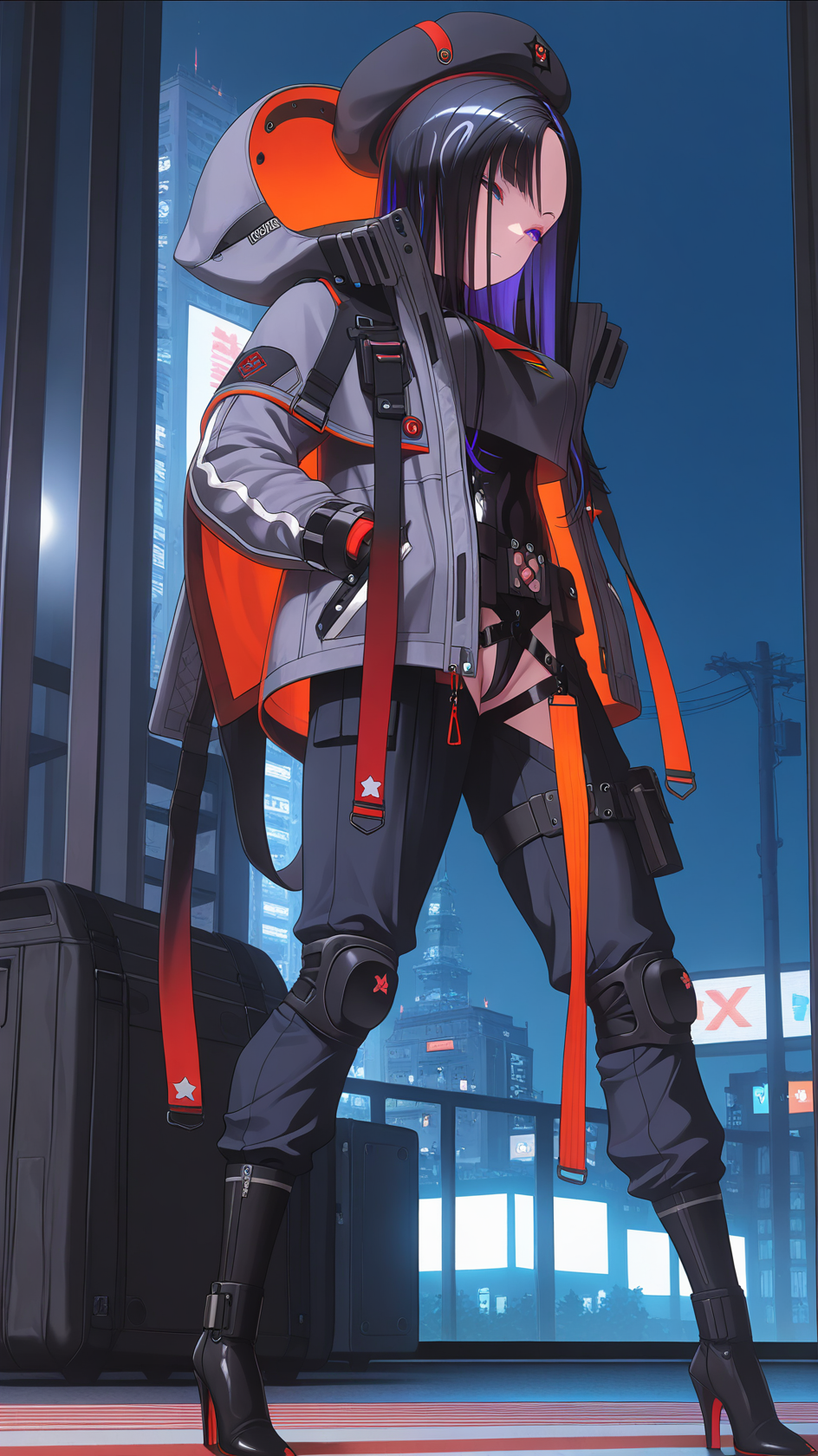 예시 프롬프트: 1girl, solo, long hair, bangs, black hair, gloves, jacket, multicolored hair, boots, pants, black footwear, high heels, red gloves, headwear removed, high heel boots, knee pads, hood, black jacket, black headwear, beret,