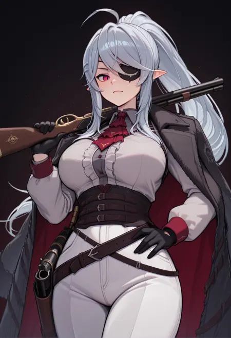 ggbbrn, 뾰족한 귀, 아호게, 붉은 눈, 회색 눈, 이종안색, 눈매스, 회색 머리카락, 포니테일, 애스콧, 셔츠, 검은 장갑, 정장, 회색 셔츠, 중앙 프릴, 흰색 바지, 느슨한 십자 벨트, 검은 털 코트, 코트를 어깨에 두른 스타일