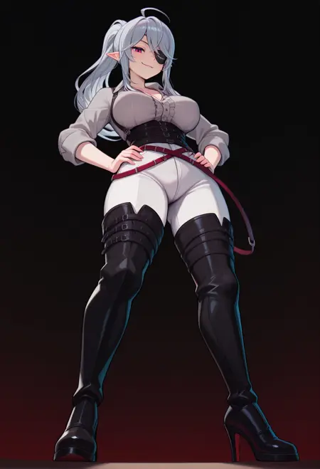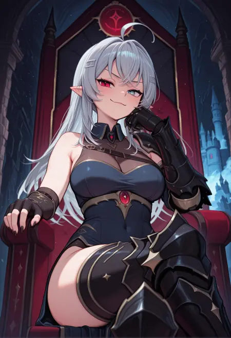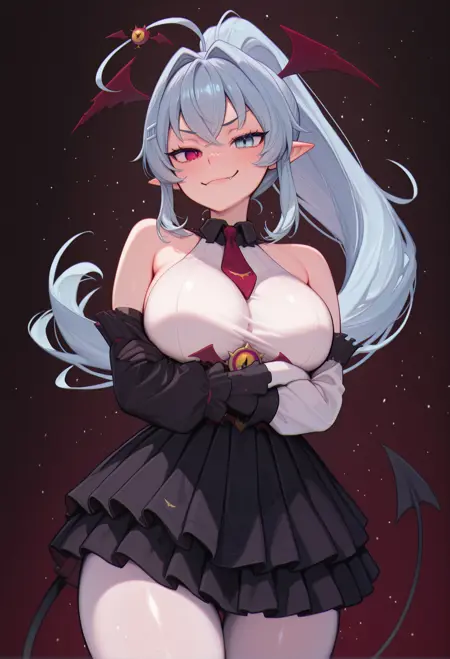 ggdsga, 뾰족한 귀, 아호게, 아호게 장식, 붉은 눈, 회색 눈, 이종안색, 흡혈귀 눈매스, 높은 포니테일, 긴 머리카락, 회색 머리카락, 헤어 인테이크, 머리 날개, 장갑, 넥타이, 불일치 장갑, 검은 주름치마, 층층이 이어진 치마, 검은 분리형 소매, 흰색 어깨 노출 셔츠, 흰색 팬티후스, 악마 꼬리, 눈 장식, 눈 벨트
