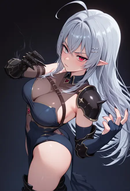 ggdft, 뾰족한 귀, 아호게, 붉은 눈, 회색 눈, 이종안색, 긴 머리카락, 회색 머리카락, 헤어 클립, 어두운 청색 어깨 노출 드레스, 가슴 벨트, 투명한 복부, 단일 장갑, 골반 커튼, 검은 갑옷 부츠, 한쪽 어깨 노출, 파란색 신부용 장갑, 팔꿈치 장갑, 단일 어깨 패드, 비대칭 장갑, 손가락 없음 장갑