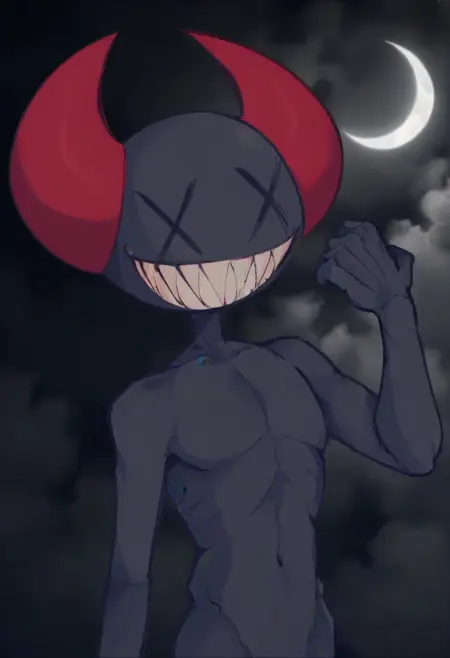 Dxtr White, red horns, 1boy, solo, X eyes, smile, teeth, sharp teeth, horns, grin, colored skin, no eyes, nude