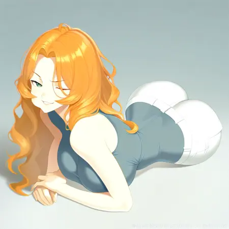 **タグ:** 1girl、スリム体型、細い腰、大きな胸、引き締まった丸いお尻、象牙色の肌、肩くらいのウェーブのある赤褐色の髪、鮮やかな緑の目、ほおの紅潮、分け目のある前髪、片方の目に髪がかかる