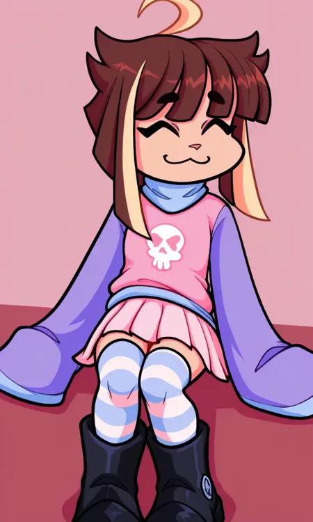 | 학습된 단어 | Qt,1girl, brown hair with blonde bangs,Short dark brown hair with lighter highlights, almost cream-colored, large fuchsia eyes,multicolored hair,sleeves past fingers, pink shirt,pink skirt, long sleeves, pleated skirt,heart-shaped pupils, pink eyes, :3,skull symbol, blonde streaked hair,ahoge, purple sleeves, long sleeves, blue undershirt,socks,striped clothes, skirt, boots, striped thighhighs, sleeves past wrists,black boots복사됨! |
