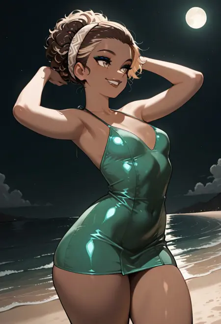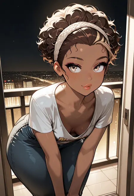 short hair, high hair bun, brown hair, curly hair, hair slicked back, blonde highlights, light brown eyes, tomboy, beautiful lips, small breasts, brown skin, latina, large hips, thick thighs, fit