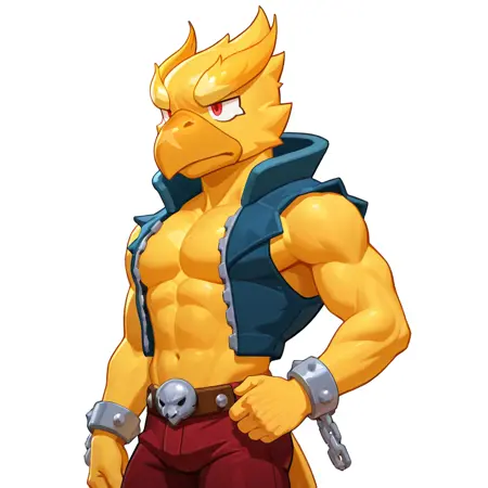 PC, crow, glowing body, yellow body, red eyes, thick eyebrows, revealing top wear, blue vest, red pants, buckle, shoes, crow (brawl stars), chains, wristwear
