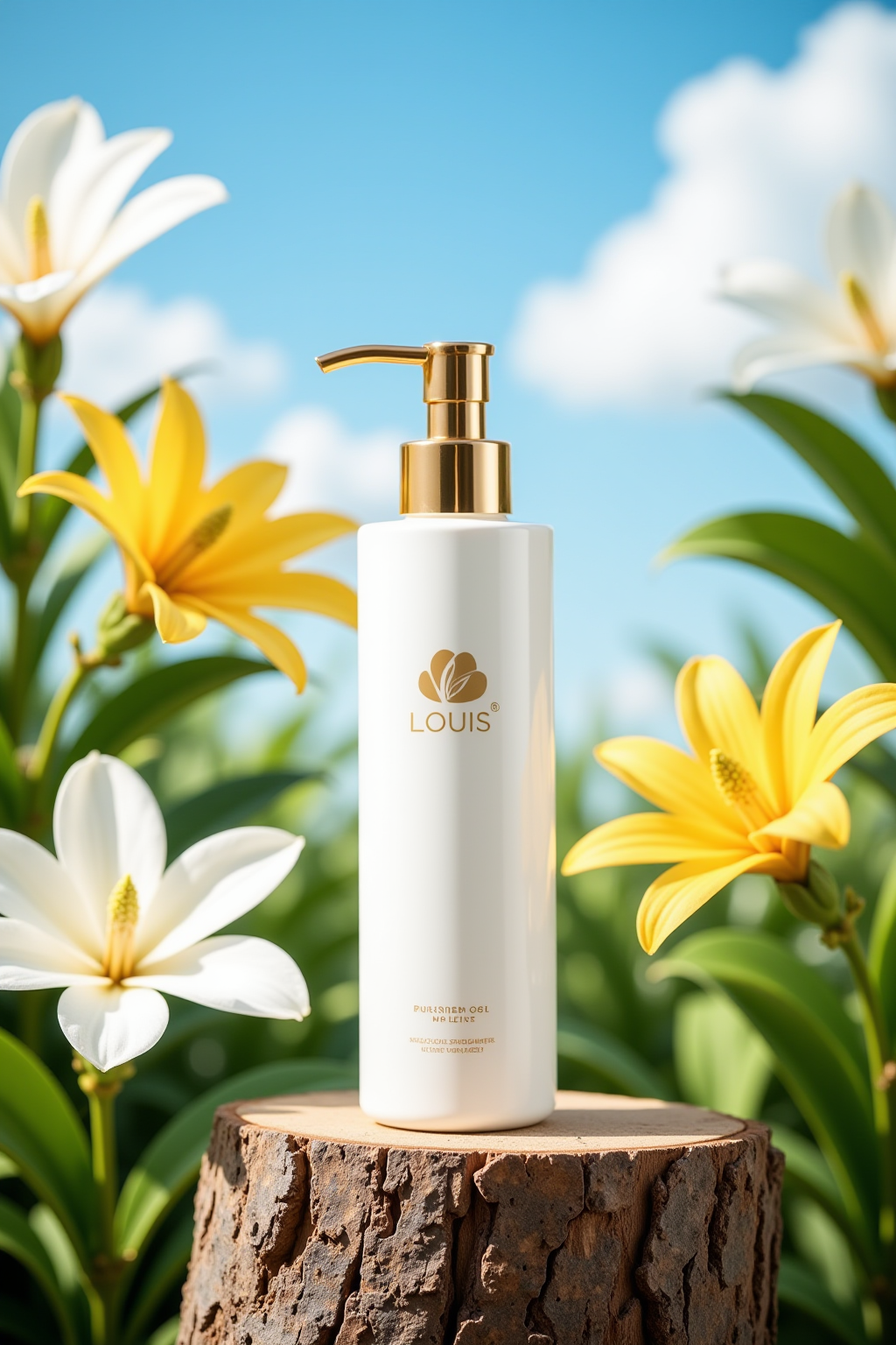changjing, In the outdoor forest, a small bottle of perfume filled with orange liquid is surrounded by green plants around the stone, blooming flowers and buds, dotted with green branches and leaves. There is a pressure pump head on the top of the perfume bottle. The brand name "LOUIS" is written on the bottle of perfume. Natural light, high-quality masterpiece. Photography Master, 8k
