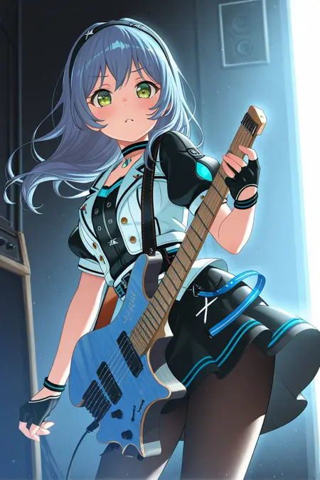 asahirokka, 1girl, solo, green eyes, skirt, glasses, necktie, jacket, smile, school uniform, looking at viewer, blue hair, green skirt, scrunchie, pleated skirt, black-framed eyewear, hair ornament, plaid, hair scrunchie, shirt, grey jacket, striped necktie, red scrunchie, striped, blazer, haneoka school uniform