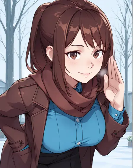 1girl, anna_koryagina, 棕髪, 青シャツ, 棕色の目, 長髪, ポニーテール, 前髪, 軍用車両, パンティーストッキング, タンク, ペンシルスカート, セーター, スカーフ