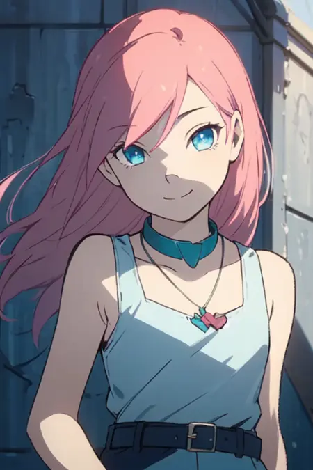 캐주얼 복장: 걸작, 최고 품질, 고화질 디테일, 1소녀, 단독, 파란 눈, 분홍색 머리, 긴 머리, 티올 목걸이, 어두운 퍼린클 스커트, 분홍 털이 달린 흰 부츠, 연한 퍼린클 탱크탑, 벨트