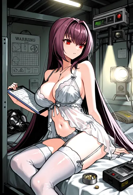 タグ: スカサハ, 1girl, solo, 長い紫髪, 赤い目,