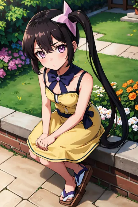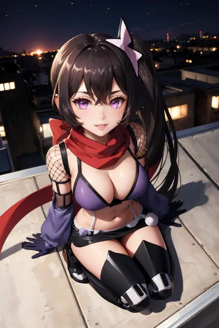 그녀의 전형적인 외모를 위해 "머리 장식, 측면 포니테일, 빨간 스카프, 비키니 탑, 보라색 미니스커트, 분리형 소매, 피시넷, 장갑, 허벅지까지 오는 양말"을 추가하세요.
