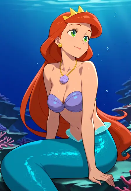 外見: オレンジ色の髪、長い髪、緑の目、中程度の胸、 Crown、イヤリング、モンスター娘、人魚、緑の尾、うろこ