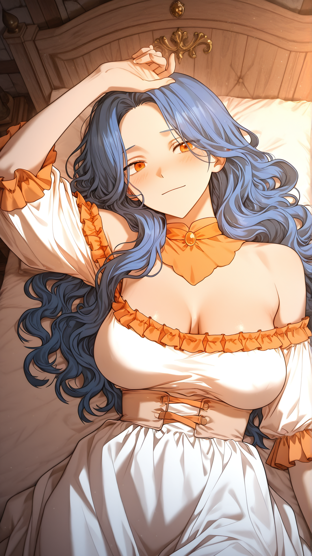 외모: 1소녀, 긴 머리, 파란 머리, 물결 모양 머리, 주황색 눈, 가슴, 중간 크기 가슴,
