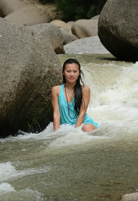 Main tag: in waterfall (adds a waterfall in the picture; leave out if you want water interaction in other scenarios - can make sense for showers etc. and make for some surreal fun in environments not normally associated with water.)