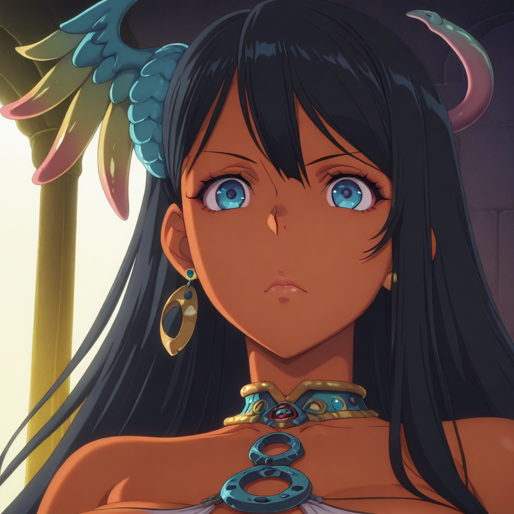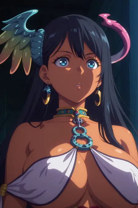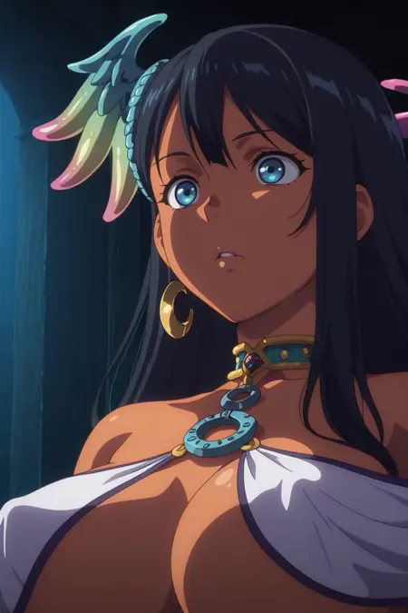 루나 루나, 긴 머리, 검은 머리, 파란 눈, 귀걸이, 검은 피부를 가진 여성, 머리 장식, 허벅지까지 오는 양말, 보석, 피시넷, 드러나는 옷, 큰 가슴