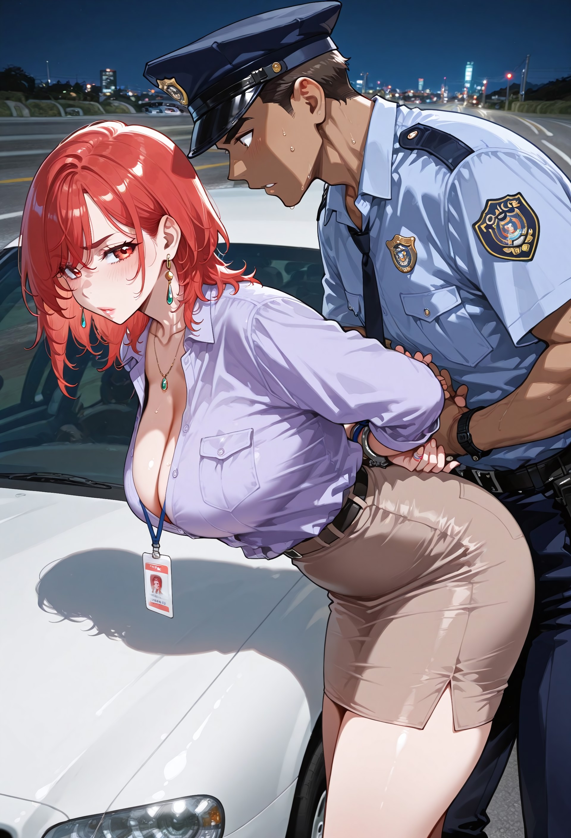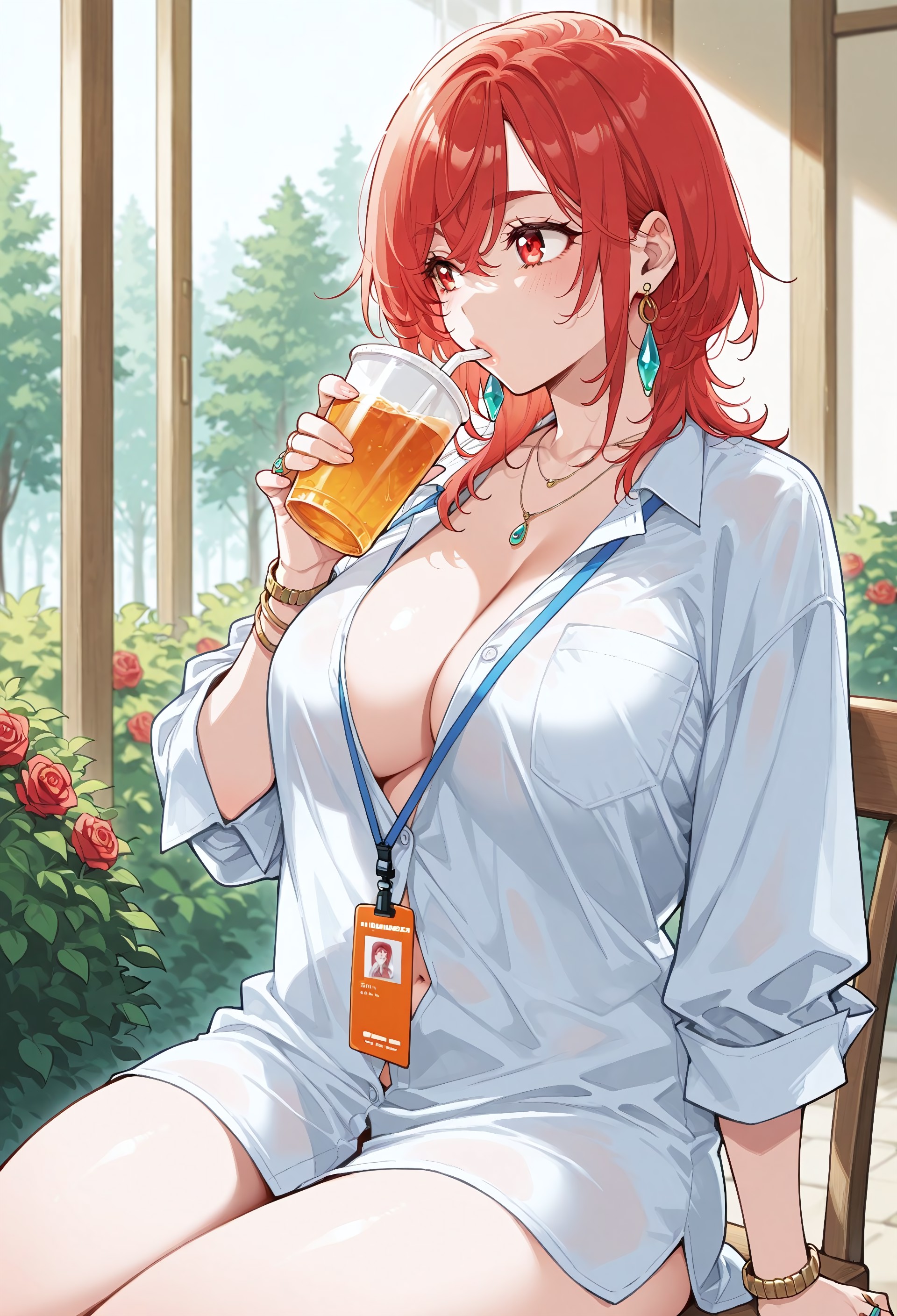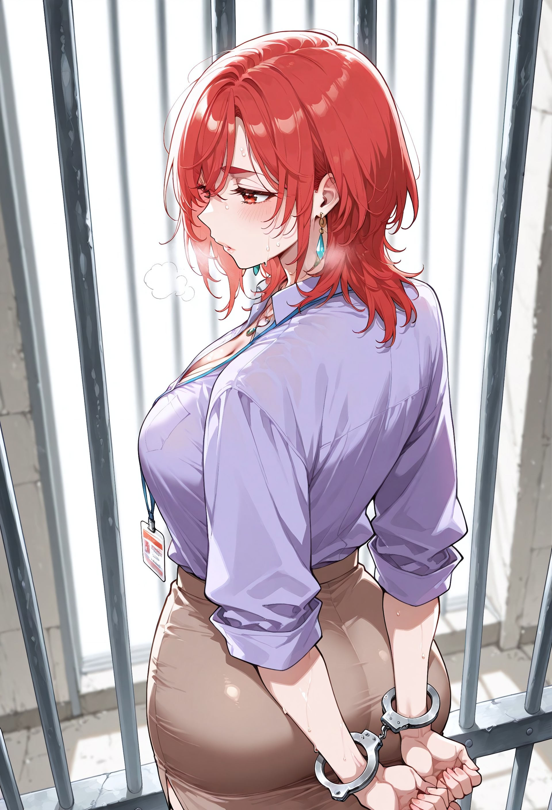 보석, 목걸이, 귀걸이, 신분증, 끈, 보라색 셔츠, 칼라 셔츠, 소매 말아 올림, 부분적으로 단추 풀림, 반지, 팔찌, 갈색 치마, 연필 치마