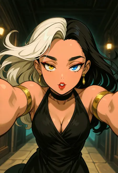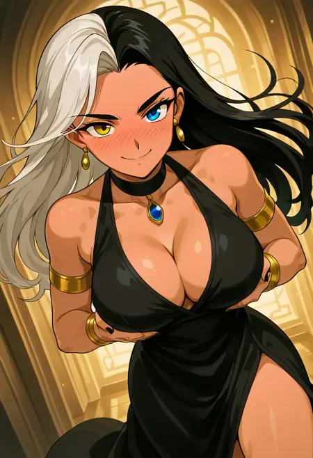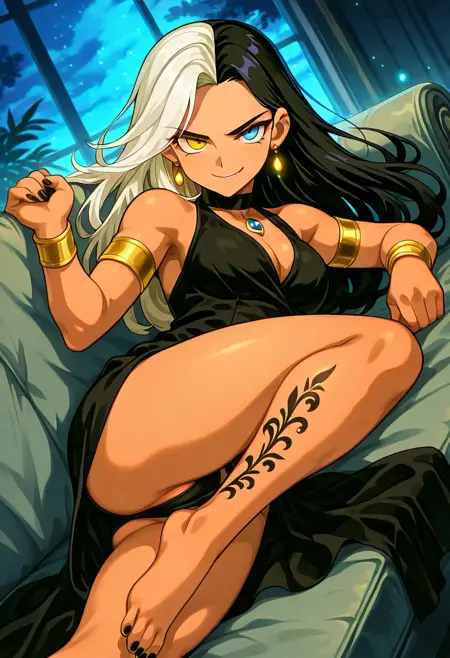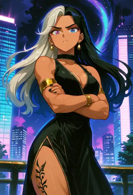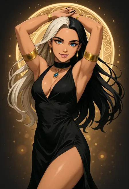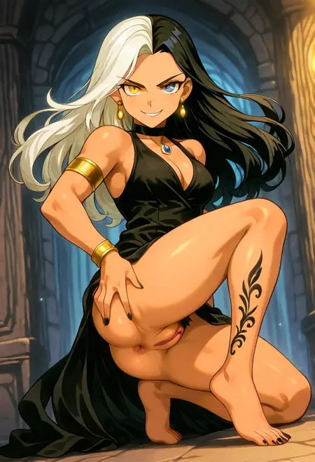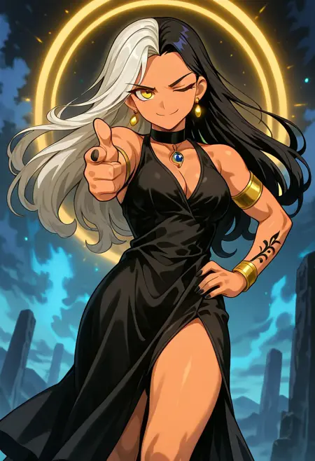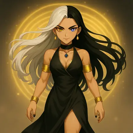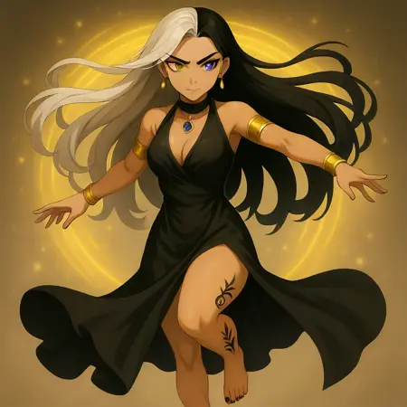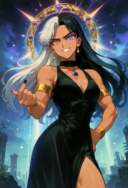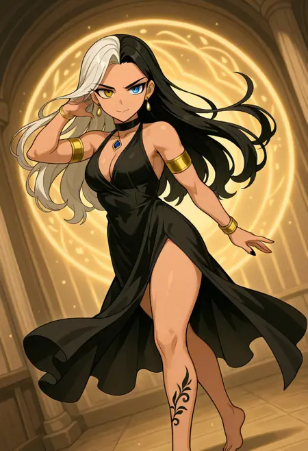 KalystrixOC,1个女孩,单独,古铜色皮肤,高个子女性,长发,双色发,分色发,左侧白色,右侧黑色,飘浮的头发,异瞳,锐利的眼睛,左眼紫色,右眼金色,金色耳环,丰满的嘴唇,项圈,金色框架的蓝色吊坠,大乳房,乳沟,黑色长裙,开衩裙,露背裙,垂坠裙,金色手镯,金色臂环,裸露的肩膀,左腿上有部落纹身,赤脚,神秘光环,黑色指甲油,珠宝,