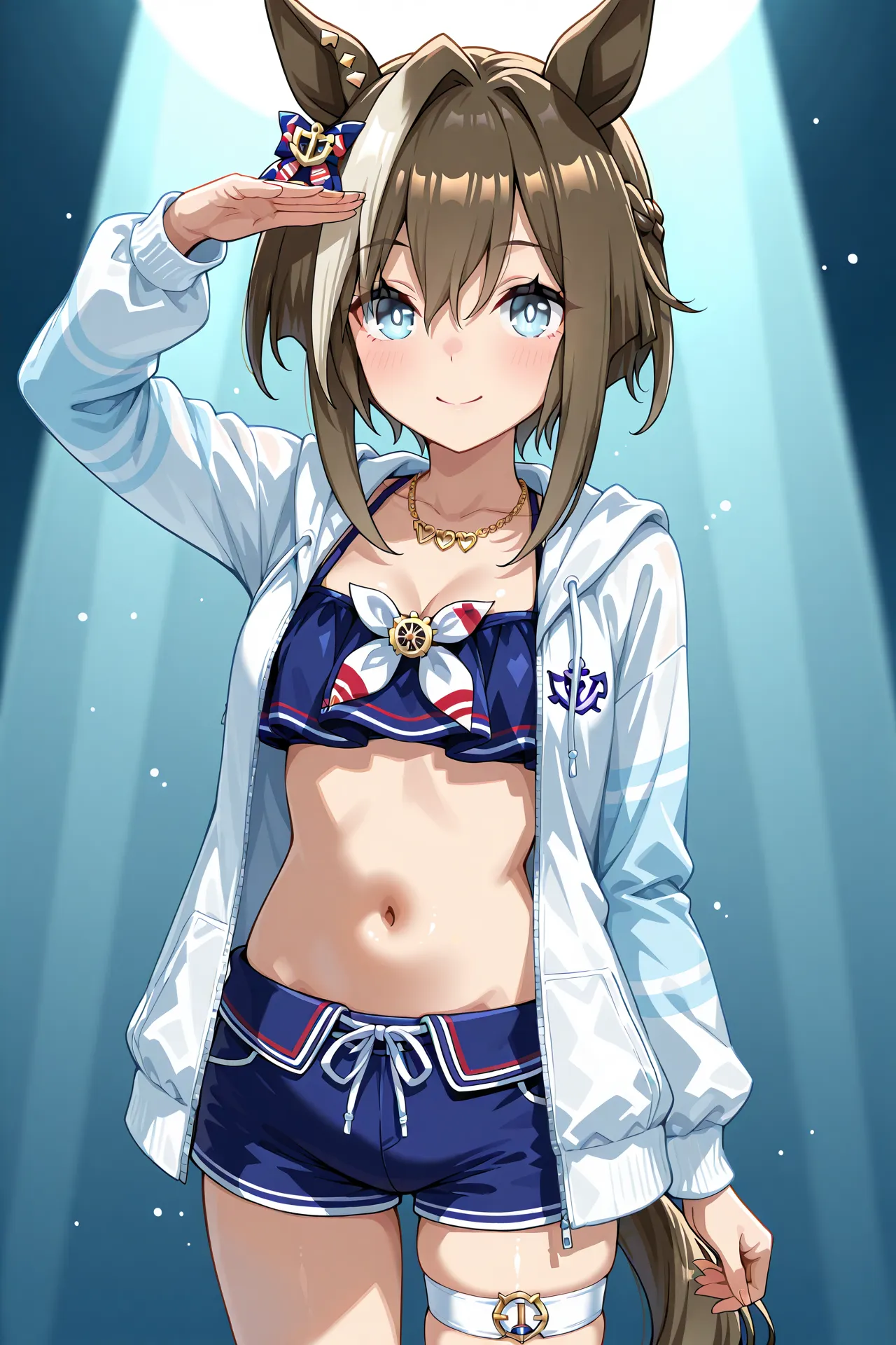 말 소녀, 말 꼬리, 말 귀, 갈색 머리카락, 흰 머리카락, 줄무늬 머리카락, 단발, 눈 사이 머리카락, 파란 눈, 머리 장식, 귀 장식,
