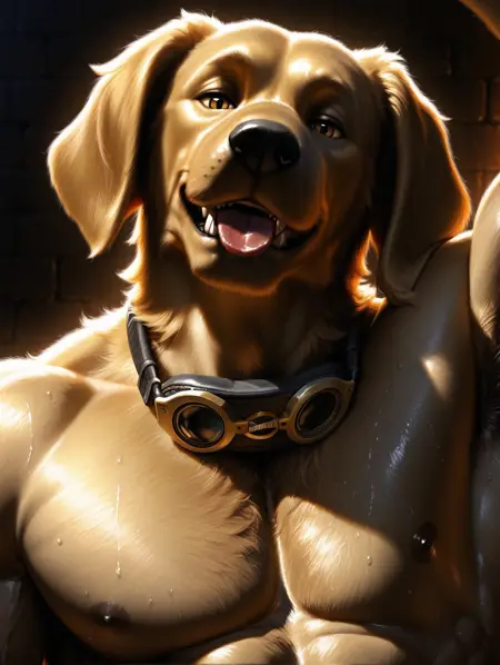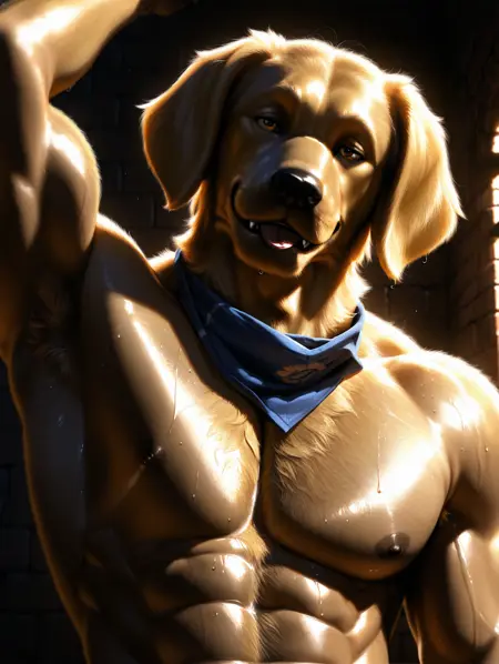 Mudbud, Male anthro golden retriever, gold fur, spots of mud on fur, handkerchief around neck, humanoid feet and hands, hands with palms, feet with soles