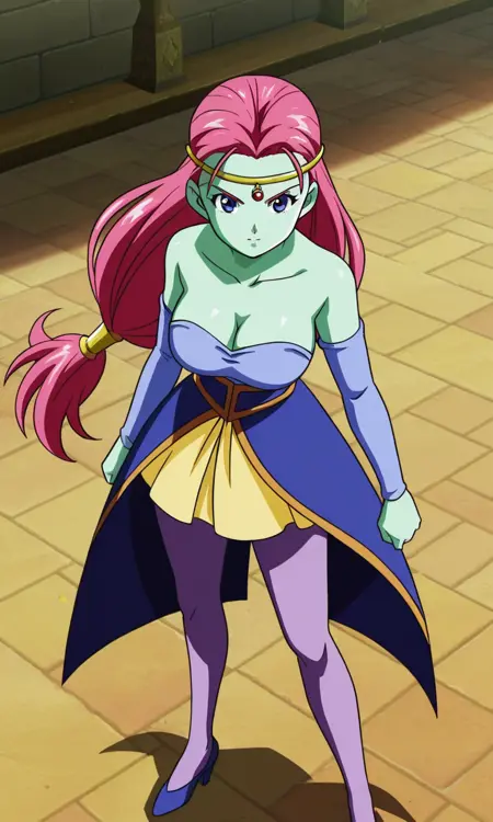 caway,1girl,solo,long hair, blue eyes, pink hair, low-tied long hair, green skin, colored skin,circlet, gold headwear, detached sleeves, strapless, blue dress, cleavage, bare shoulders, yellow skirt, pantyhose, purple legwear, high heels, blue footwear,large breasts,