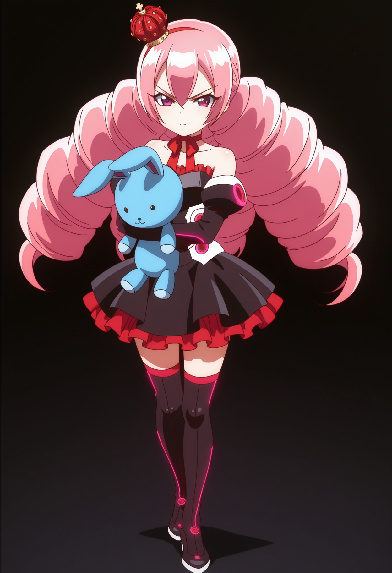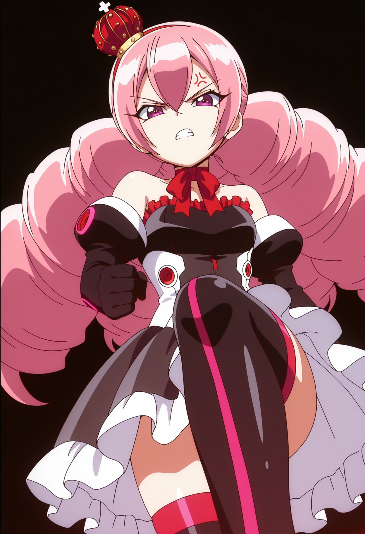 1girl, solo, miku zeze, long hair, pink hair, purple eyes, hair between eyes, mini crown, twintails, bangs, drill hair