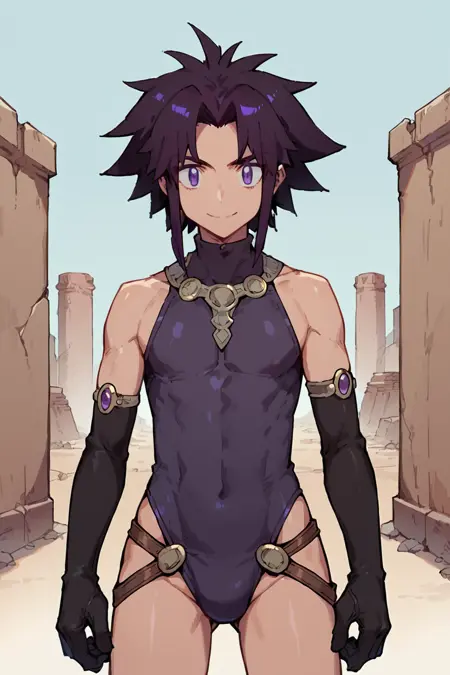 revin,1boy,pants,red_shirt,black_bow,elbow_gloves,shoes,spiked_hair,black_hair,
