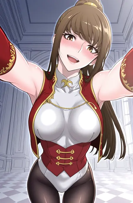 Karam_outfit2、白いハイネックレオタード、赤とゴールドのノースリーブベスト、オープンフロントベスト、胸元カバー、ゴールドのトリム、非対称な赤いデザイン、赤いコルセットのラッピング、赤いロンググローブ、黒いパンティーホース、黒いハイヒール