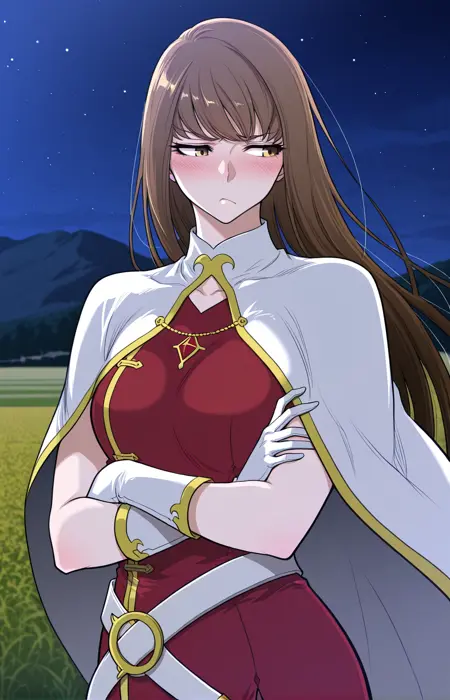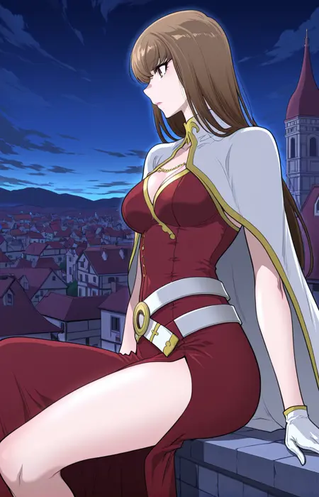 Karam_outfit1、赤いドレス、ノースリーブ、フィットネスドレス、ハイスリット、ゴールドのトリム、幅広の白いベルト、ゴールドの円形バックル、白い手袋、白いショルダーケープ、ゴールドトリムのケープ、高い襟のある白いケープ、白いハイヒール