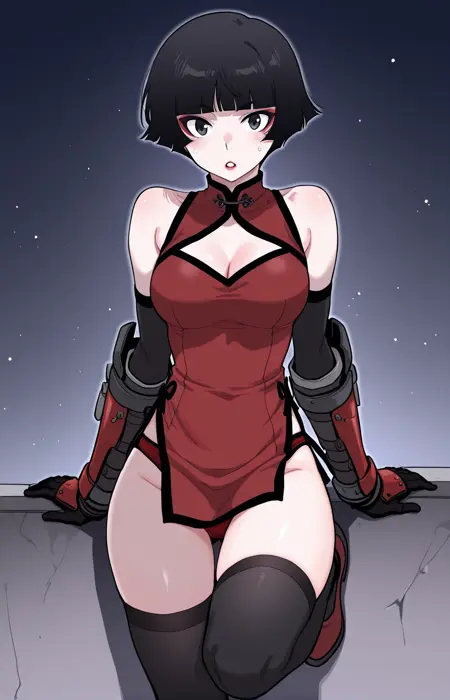 | トレーニングワード | Hina, 1 girl, solo, short hair, black hair, straight hair, blunt bangs, black eyes, thick eyebrows, red eye makeup,コピーしました! Hina_outfit1, red sleeveless qipao, black trim, cleavage cutout, high collar, frog fasteners, side slits, tight red panties, long black gloves, metallic armguards, black thighhighs, red shoes,コピーしました! Hina_outfit2, black sleeveless dress, short dress, v-neck, red trim, decorative embroidery, side slit, open sides, black thighhighs, red shoesコピーしました! |