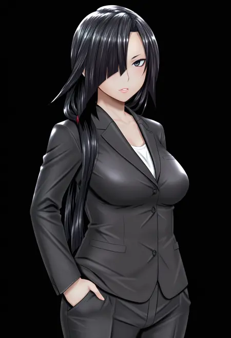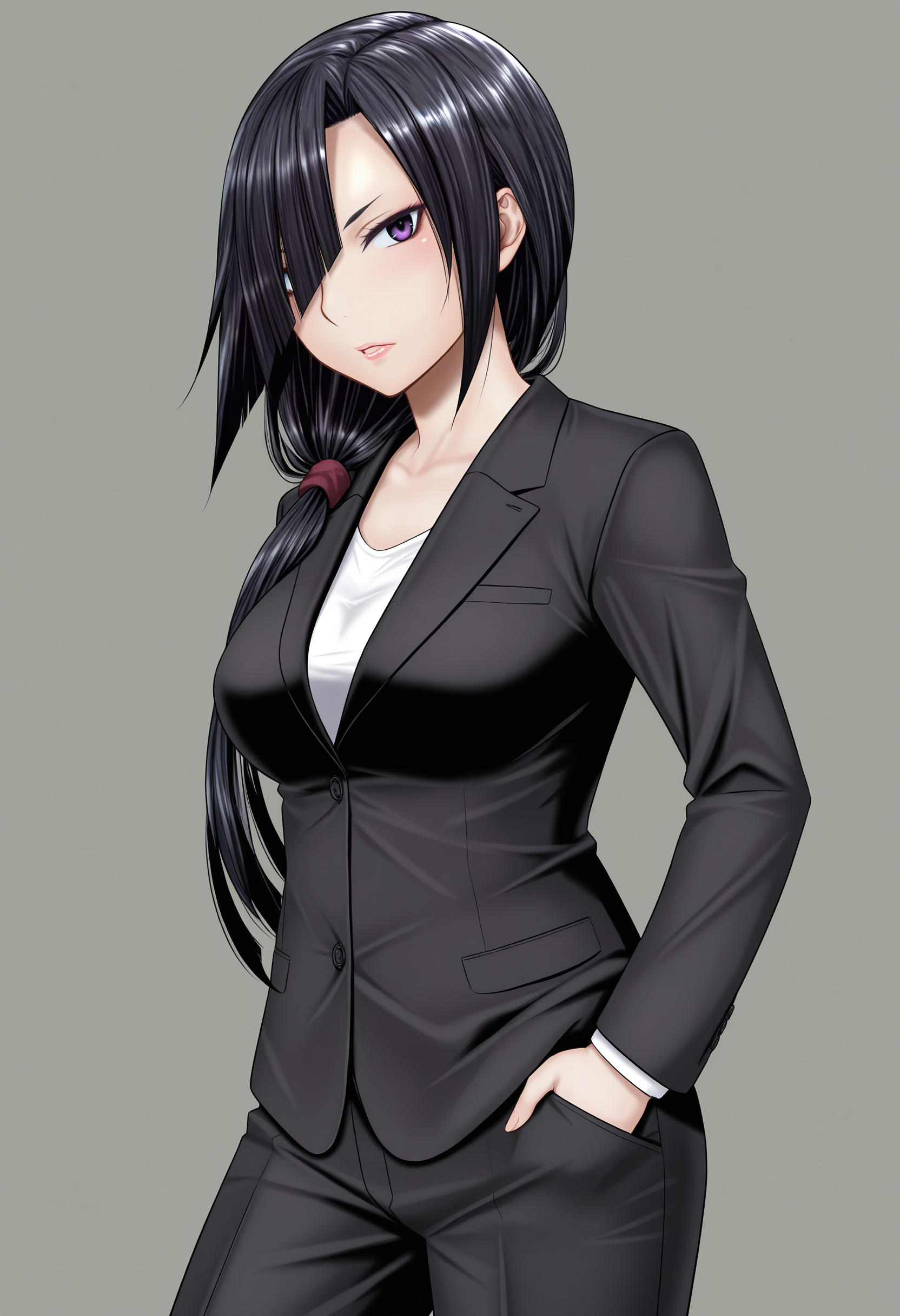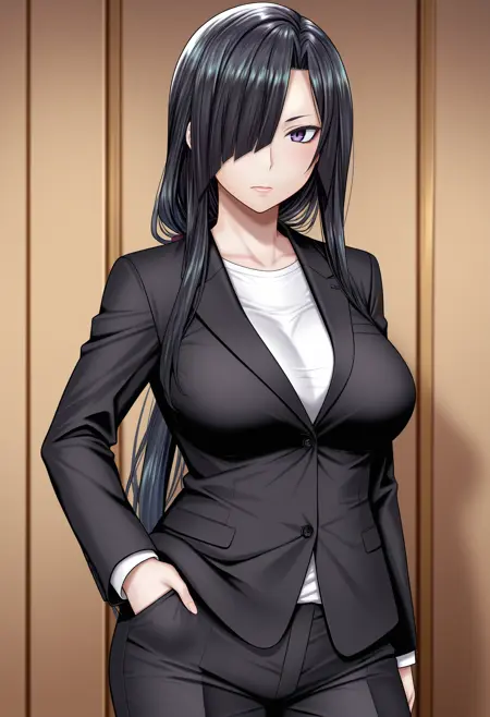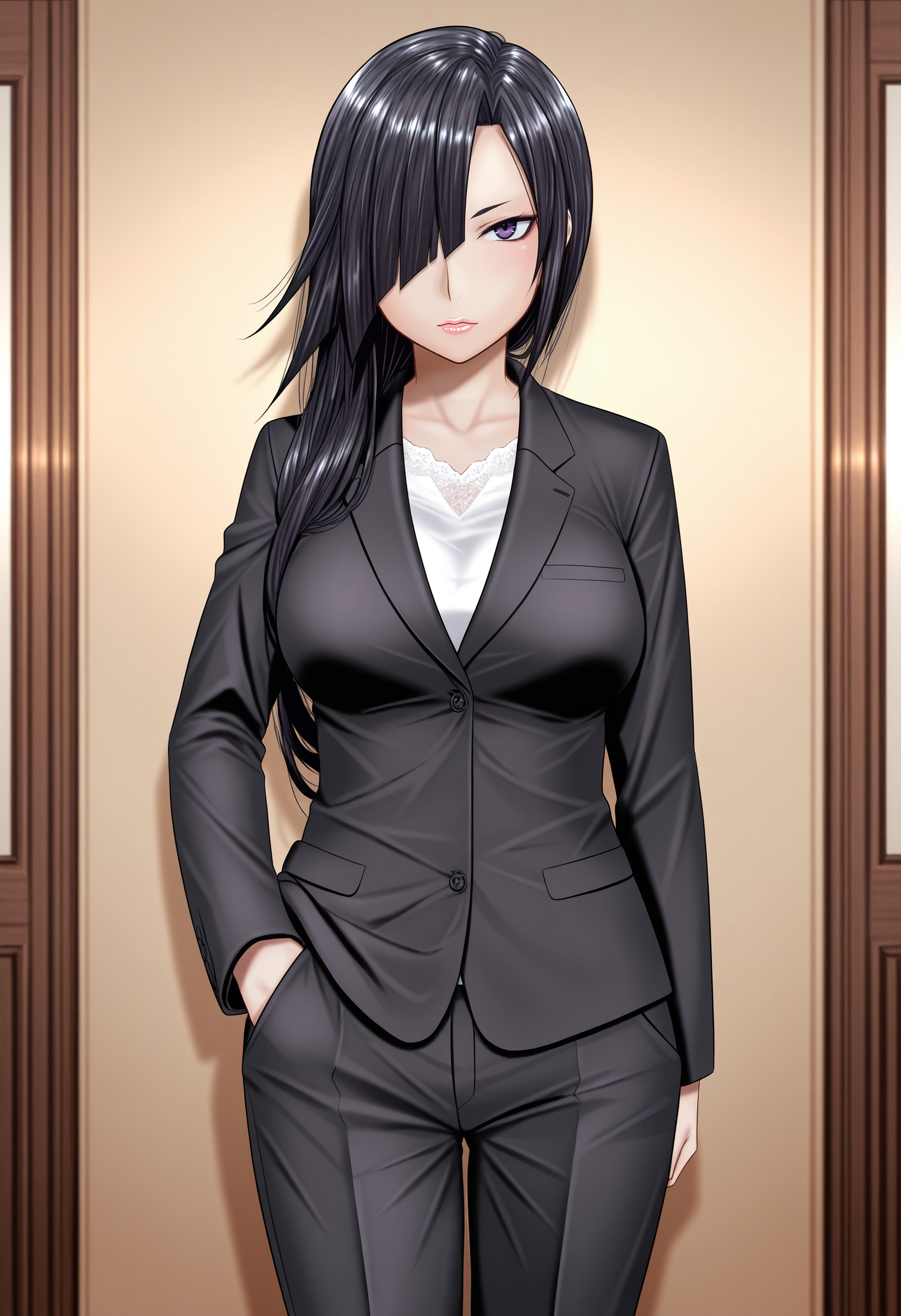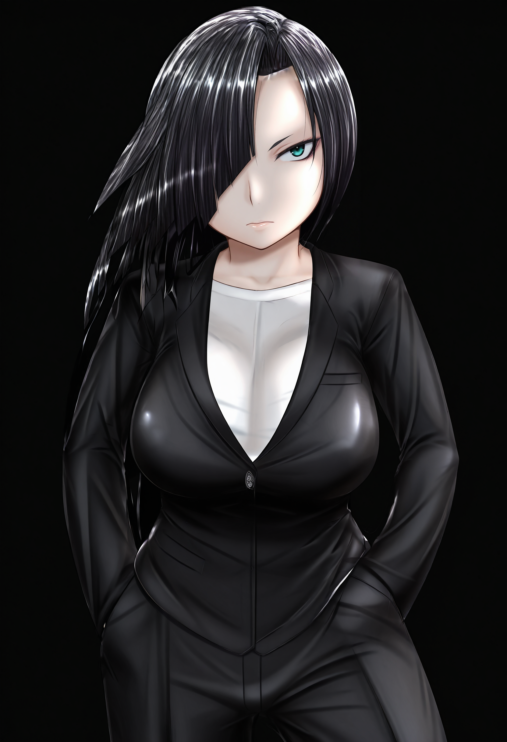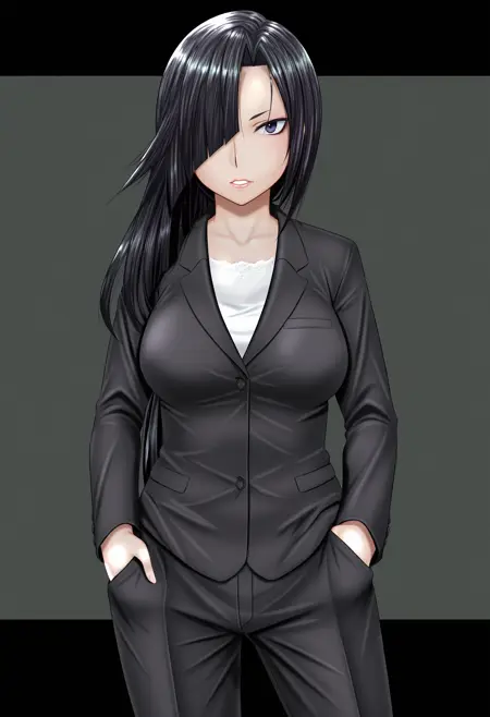 린코, 성숙한 여성, 1소녀, 입술 아래 점, 한쪽 눈에 머리카락, 검은 머리, 점, 솔로, 손을 주머니에 넣음, 바지, 정장, 정장, 긴 머리, 시청자 바라봄, 가슴, 재킷,