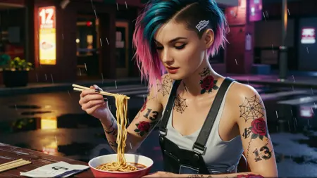 Cyberpunk Judy Alvarez, a young Latina woman with a partially shaved undercut and short, neon green hair with pink tips, Her arms, neck, and part of her torso are covered with tattoos including roses, spider webs and the number 13, She has bold eyeliner, pink lipstick