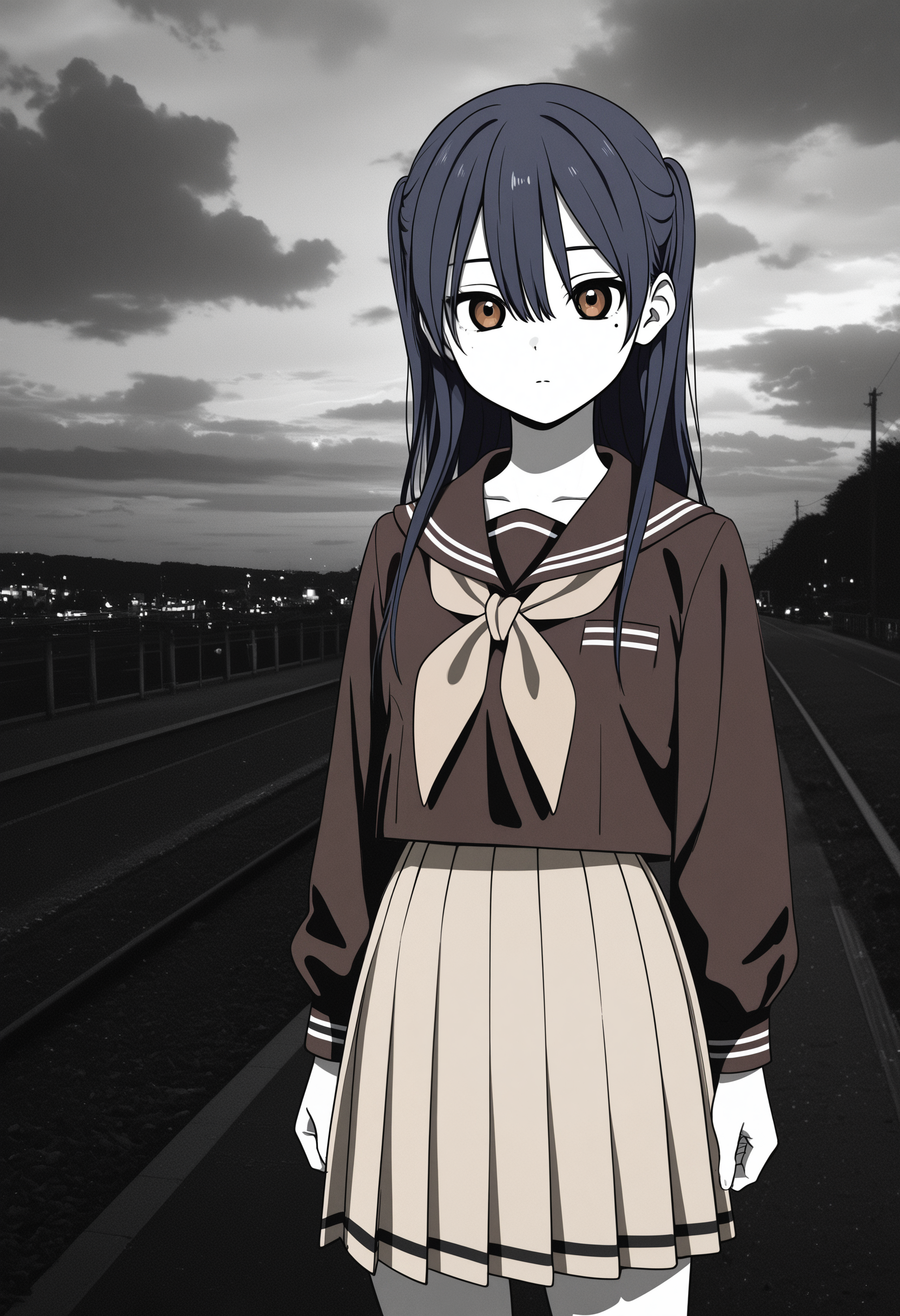 1girl, solo, ichigyo_ruri_a, anime screenshot, long hair, low twintails, dark blue hair, brown eyes, hair between eyes, mole under eye,