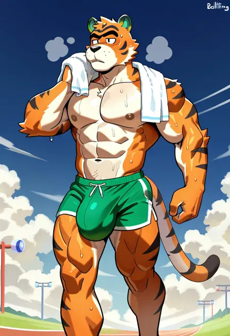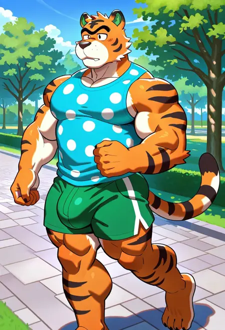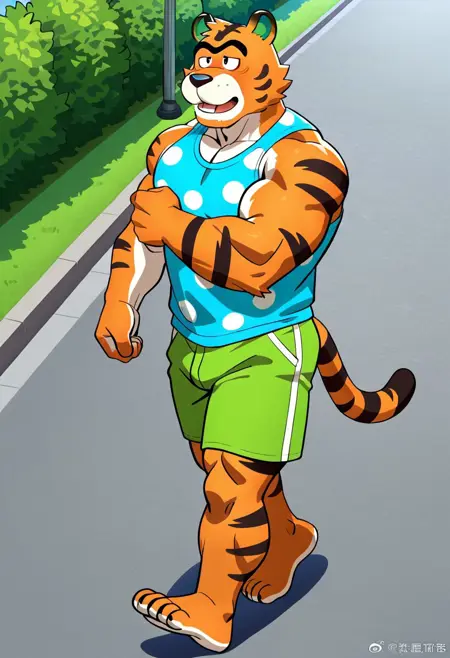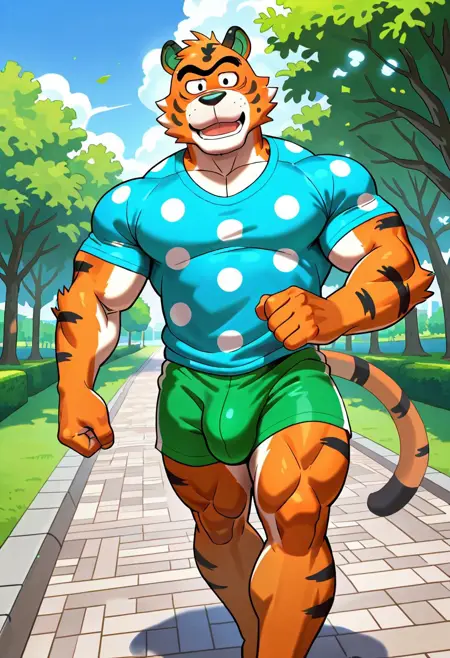 anthro, male, solo, tiger, Orange fur, two-tone fur, white mouth, white cheek tufts, unibrow, black eyes, belittling eyes, green inner ears, Blue Dot Shirt