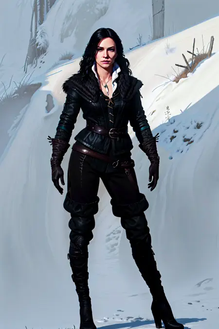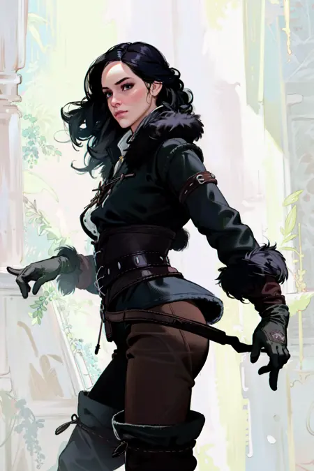 yennefer,defaultcostume,fur trim,jacket, ,black gloves,pants,thigh boots