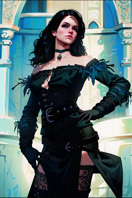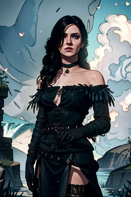 yennefer, witcheralt, thighhighs, belt, bare shoulders, black gloves,gothic, black dress,black choker, black dress, cleavage