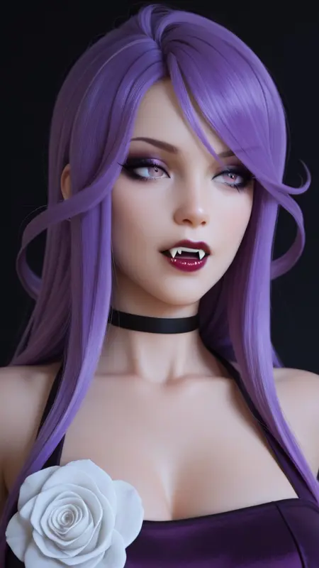 Tags: C0rdelia, 1girl, purple hair, long hair, choker, fangs, makeup, lipstick, dress, white rose, elbow gloves,