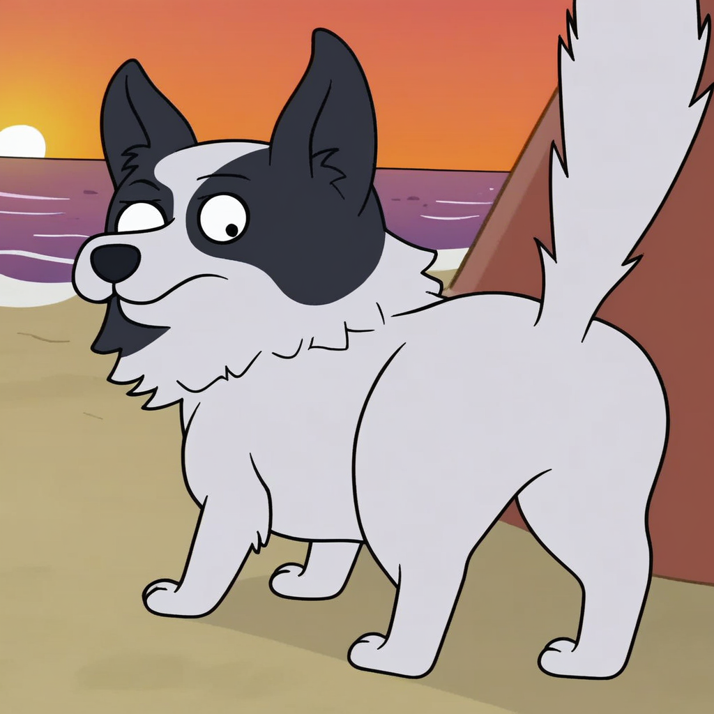 Prompt: bowie rat-a-pap bitch、野生の、犬、一人、ツートンマスク、ゴールドの首輪、骨形の名札、黒い目、濃い眉、細い眉、財布の中座っている、上半身に焦点、下半身は財布の中に隠れている、赤橙色の財布、