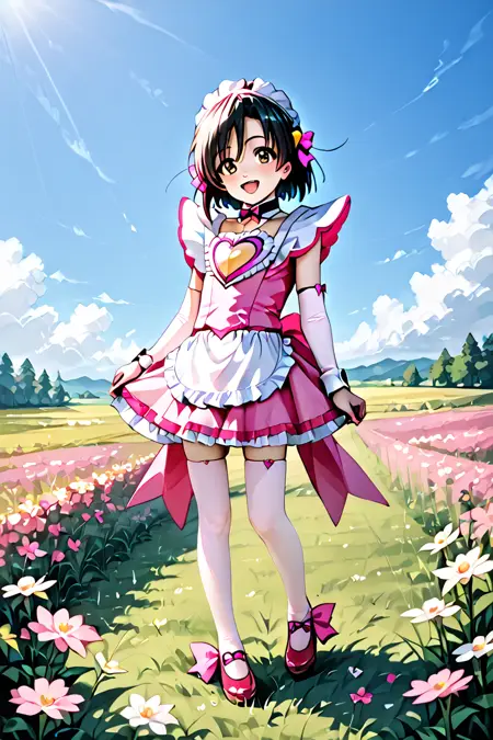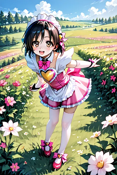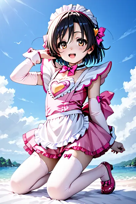 mhkokoro, 1girl, 单人, 短发, 看向观众, 黑发, 粉色连衣裙, 蝴蝶结, 丝带, 棕色眼睛, 胸前有心形, 分离式袖子, 白色过膝袜, 女仆, 绝对领域, 女仆头饰, 魔法少女, 粉色蝴蝶结, 大蝴蝶结, 全身